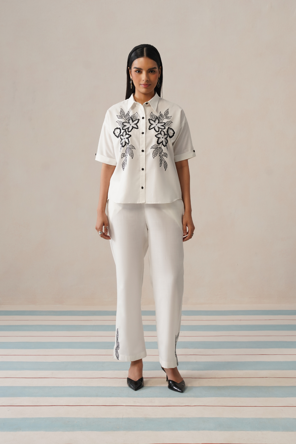 This fresh white co-ord set blends clean tailoring with delicate handcrafted detail for a look that feels modern yet timeless. The button-down shirt features bold floral embroidery across the front, creating a striking contrast that adds character while keeping the silhouette crisp and refined. Crafted from a breathable natural woven fabric with a soft textured finish, it feels light and comfortable throughout the day.