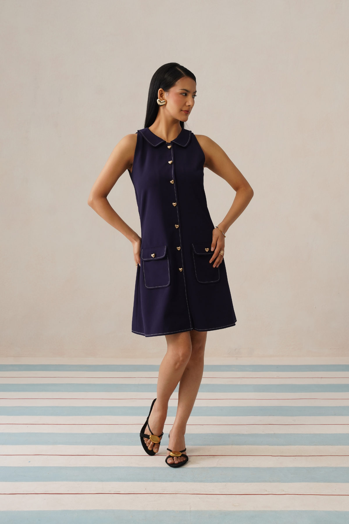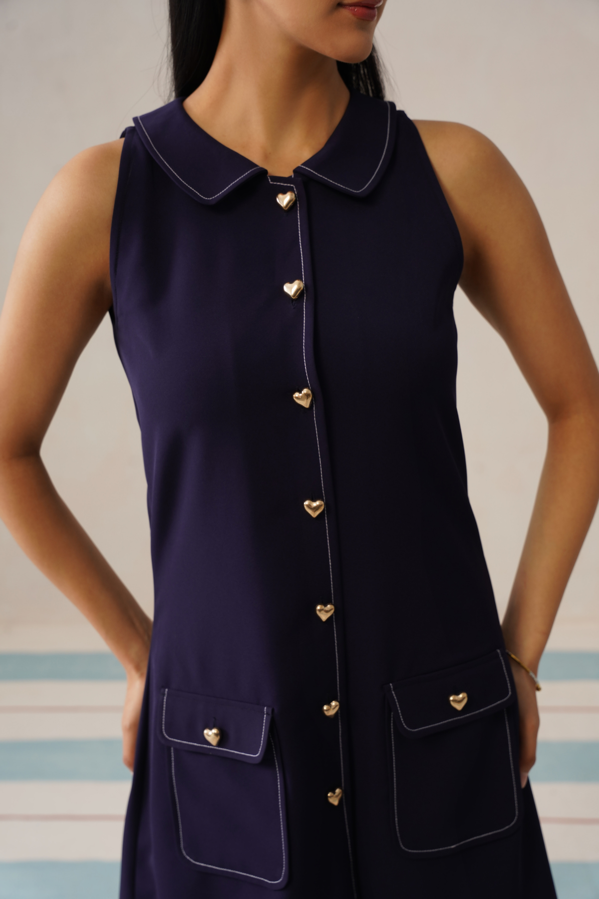 Finished with contrast stitching and neatly placed front pockets, the dress feels thoughtfully designed without being overdone. Easy to style for daytime outings or dressed up for evenings, it’s a versatile piece that brings personality to a polished wardrobe.