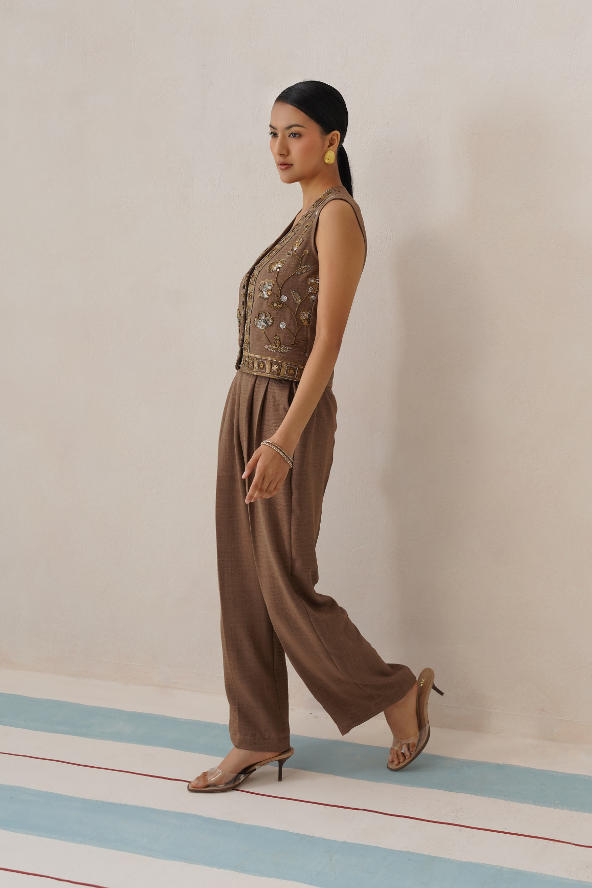 This statement co-ord set blends artisanal detailing with effortless modern tailoring. The sleeveless vest is crafted in a breathable natural woven fabric with a softly textured finish, designed to feel light yet refined against the skin. Intricate hand-style embroidery adorns the vest, featuring geometric borders along the neckline and hem paired with delicate floral-inspired motifs across the body. Subtle metallic thread accents add dimension and a soft sheen, creating depth without overpowering the clean silhouette.