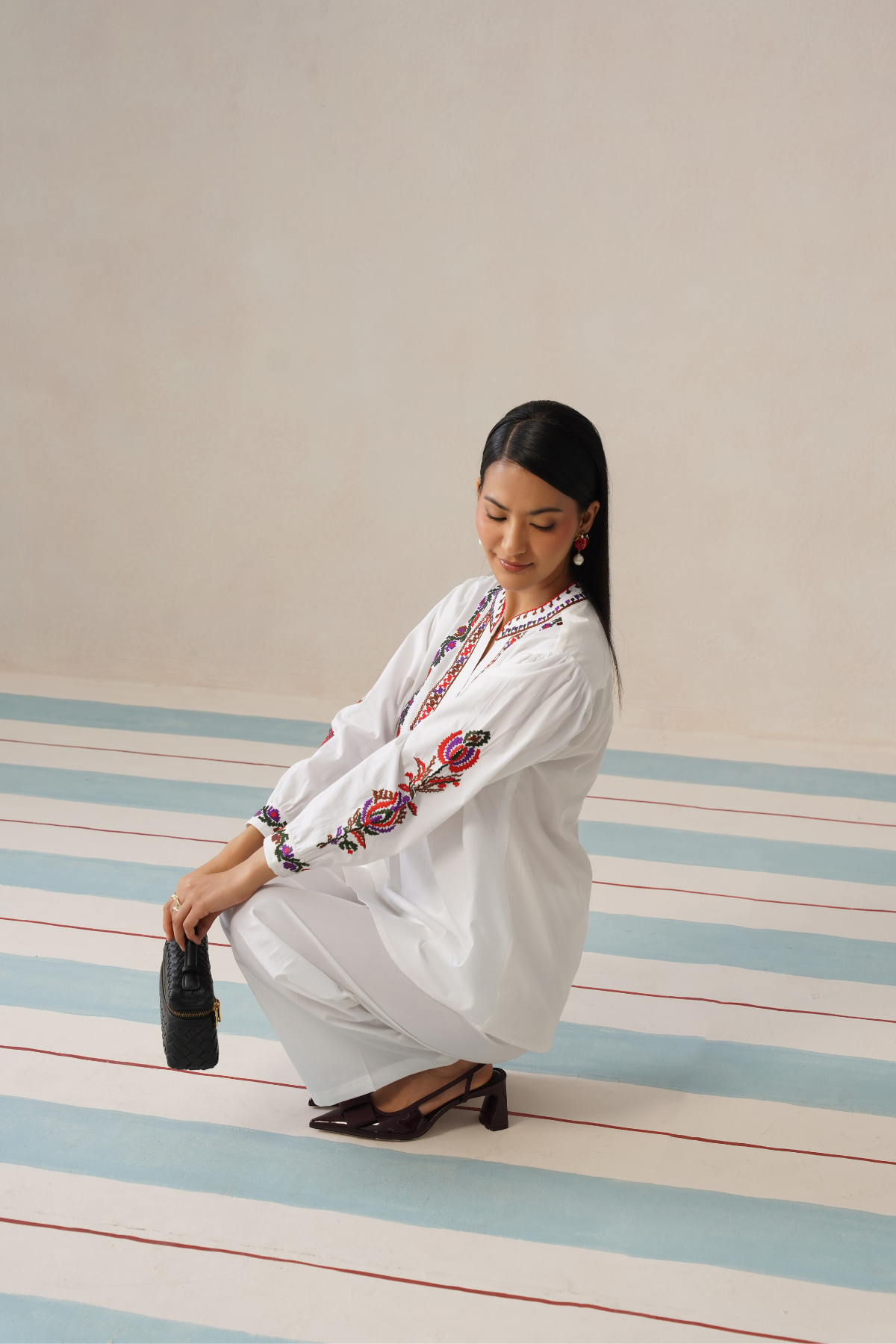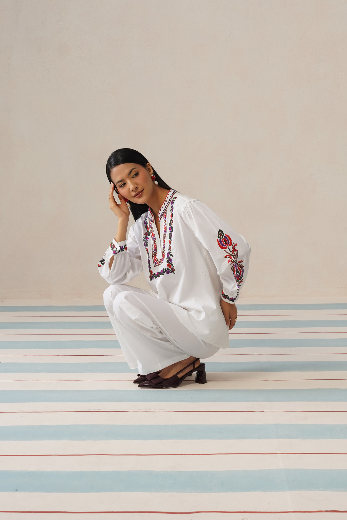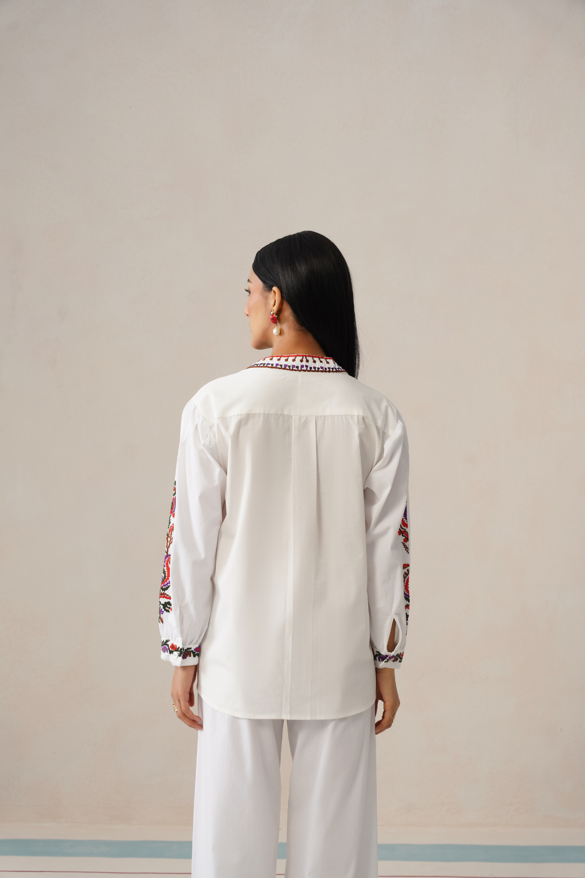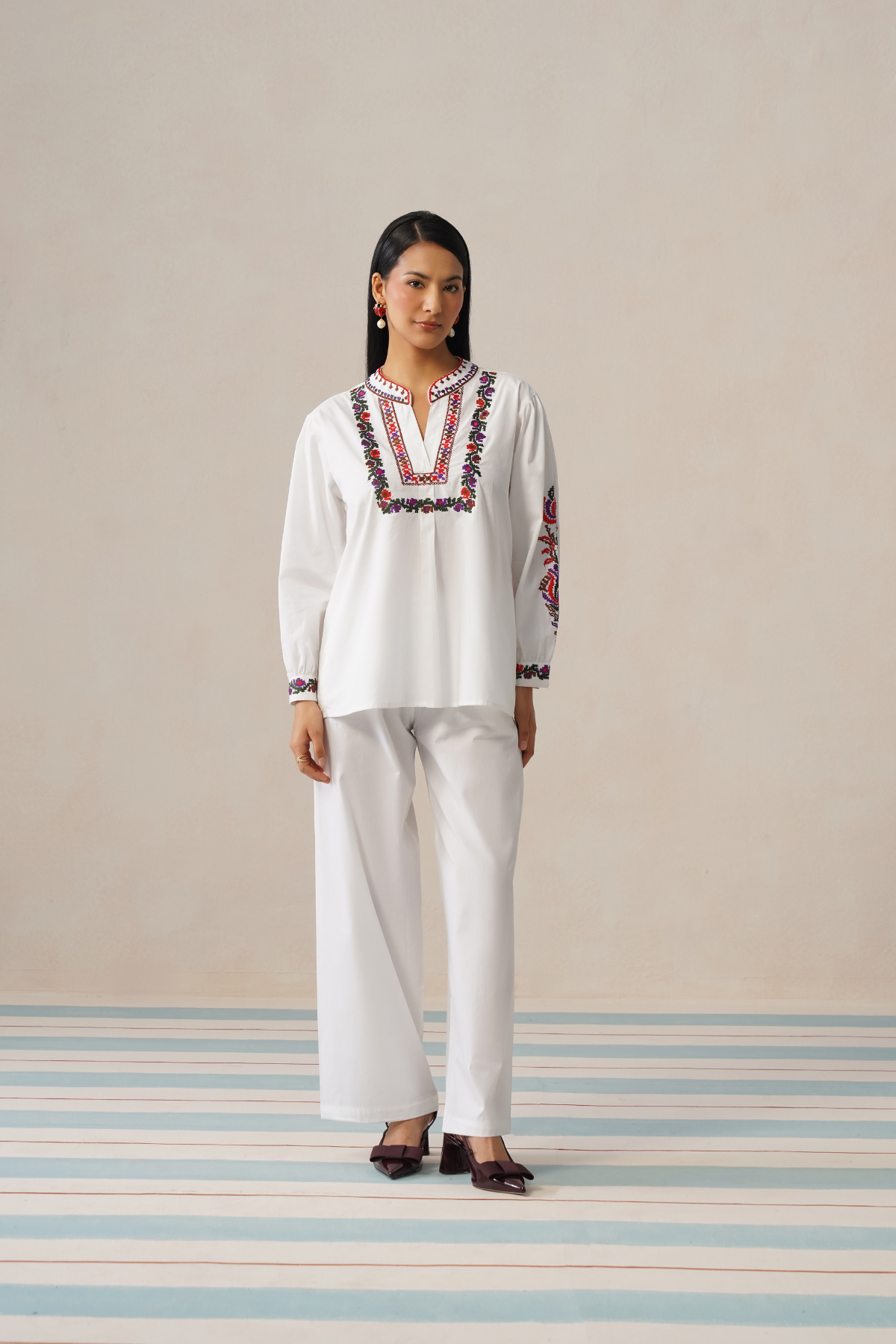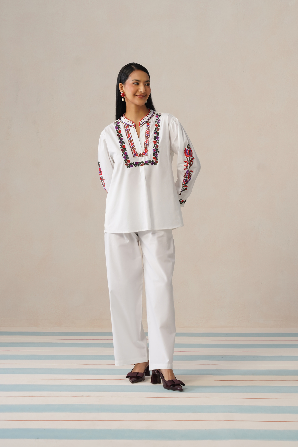 The top features a flattering V-neckline framed with intricate multicolour embroidery, adding a vibrant focal point against the fresh white base. Delicate embroidered accents along the sleeves bring balance and richness to the design without overwhelming the silhouette. Paired with relaxed straight-fit trousers, the set offers ease of movement while keeping a clean, tailored appearance.