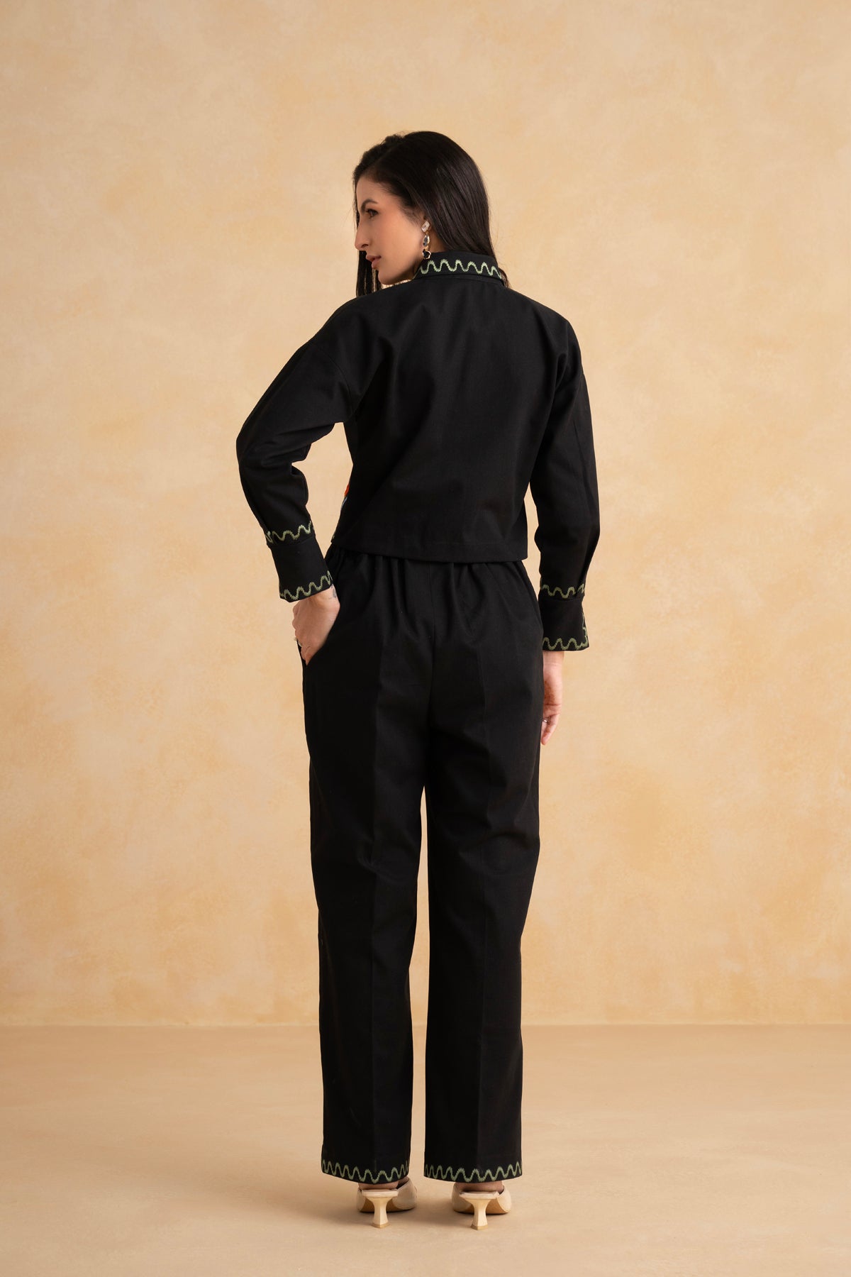 Matching straight-cut trousers showcase complementary embroidery along the sides and hem, creating a seamless, coordinated look that exudes understated elegance.