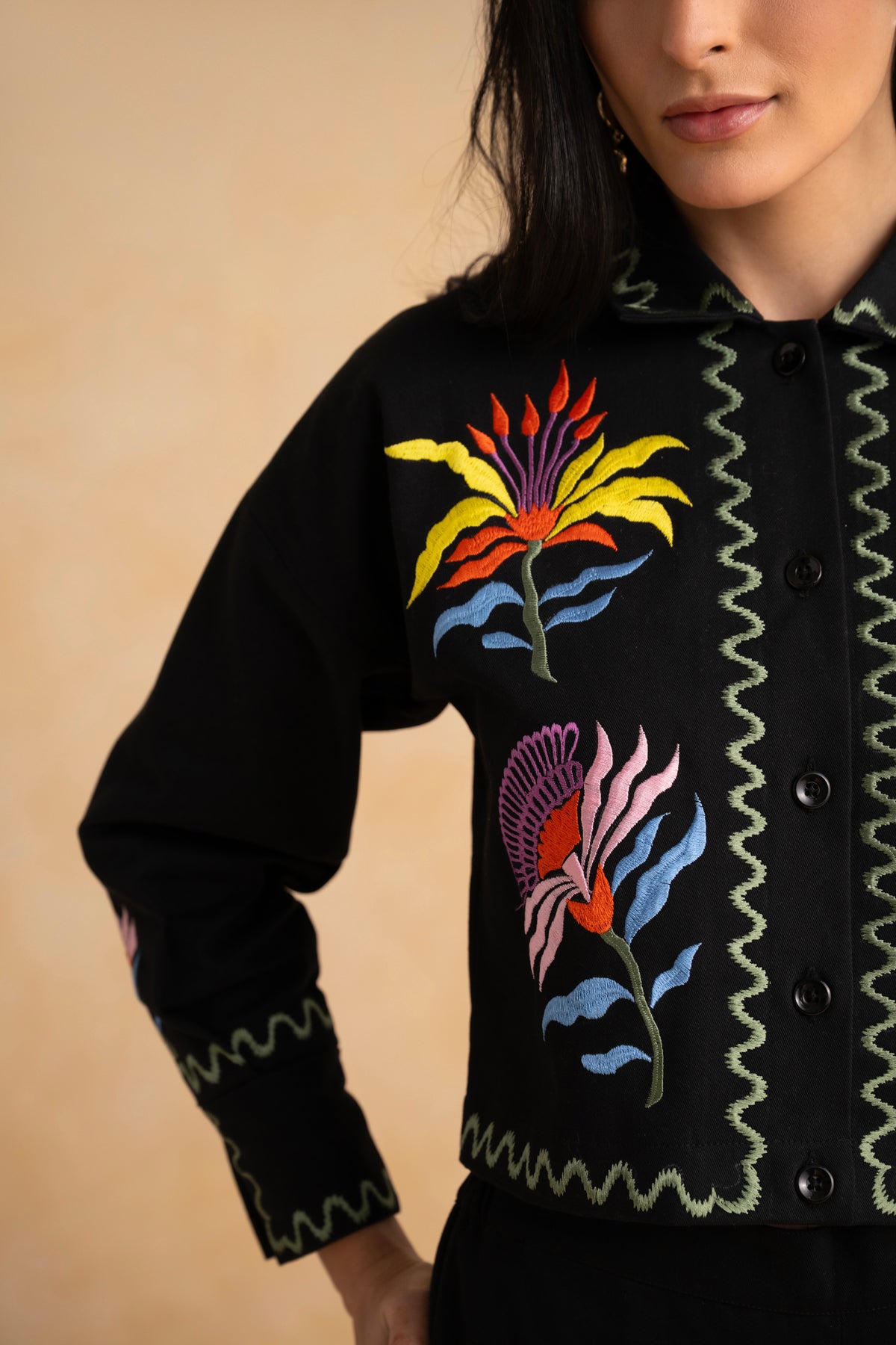 Elevate your everyday style with this striking embroidered denim co-ord set. Crafted from premium 100% cotton denim, this ensemble blends effortless sophistication with vibrant artistry. The button-down top features a relaxed silhouette, classic collar, and intricate floral embroidery in vivid hues of pink, yellow, and green — bringing a playful yet refined charm.