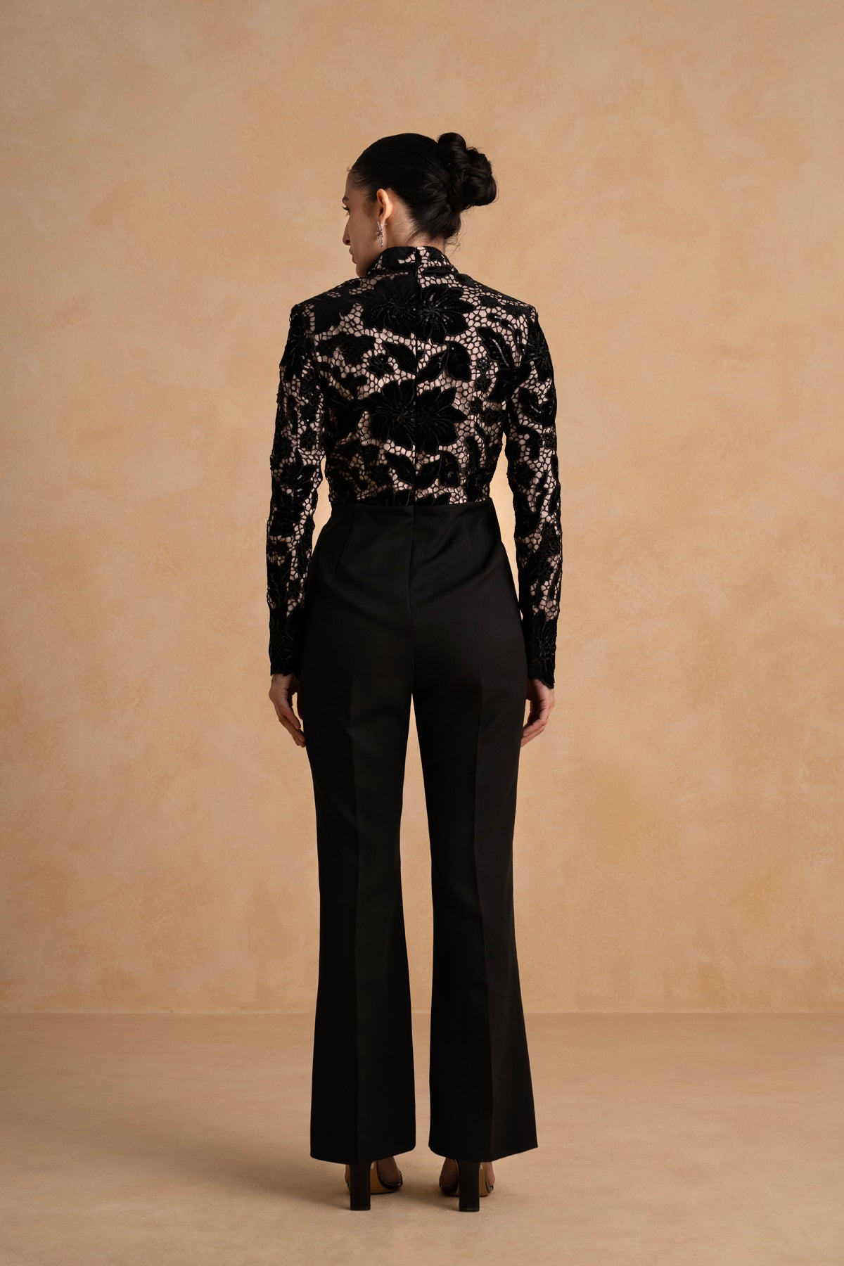 Striking and refined, this black jumpsuit is designed to make an impression with its elegant play of textures. The sheer bodice features velvet applique detailing with subtle sequin highlights, creating a soft shimmer that catches the light beautifully.