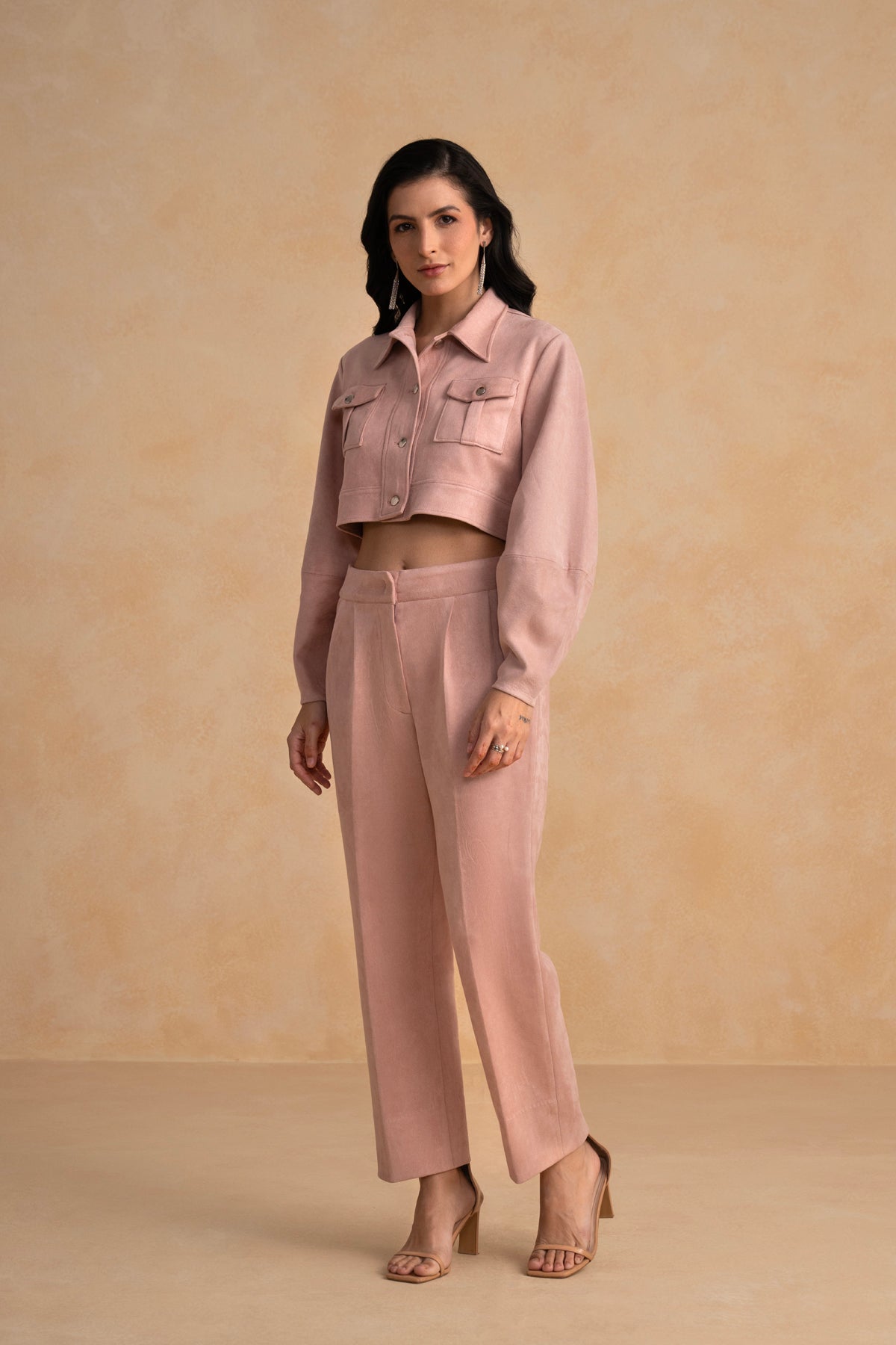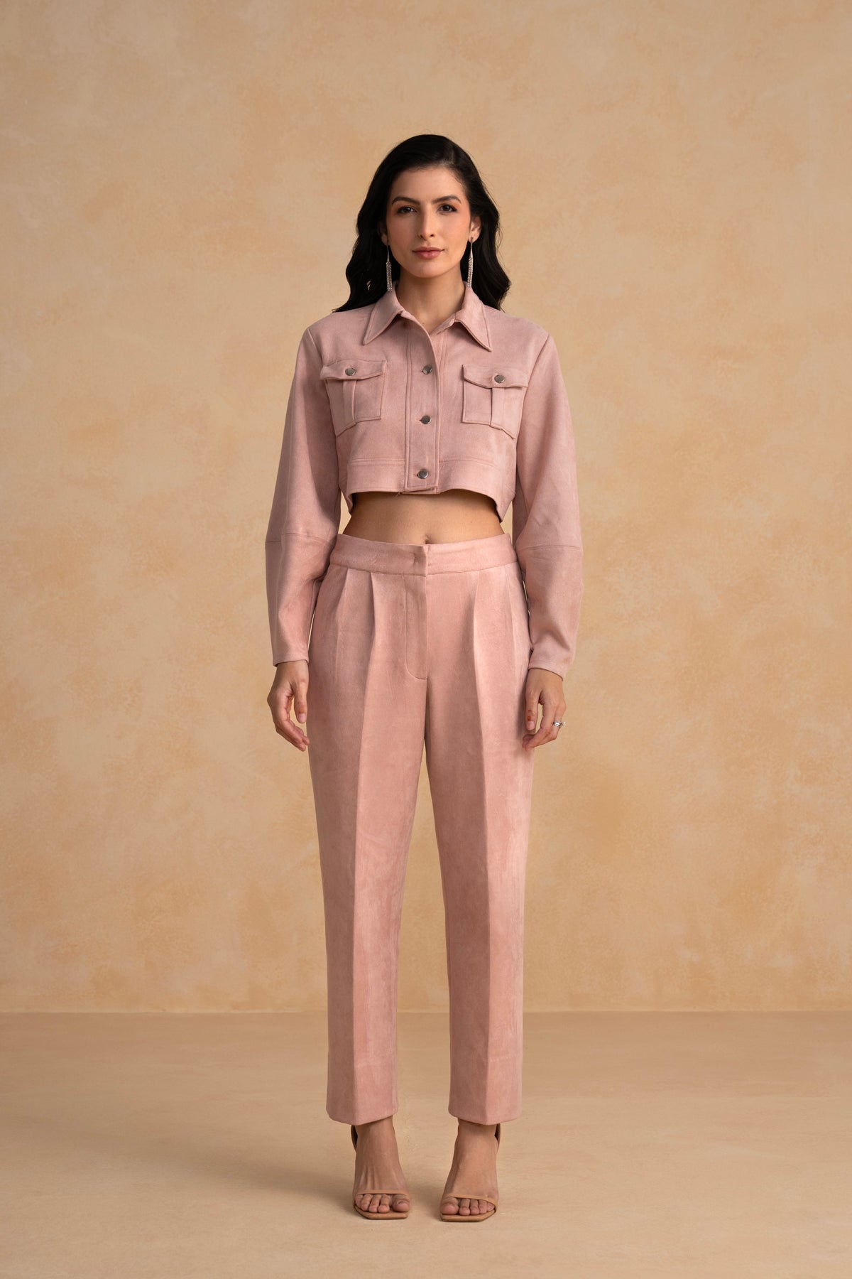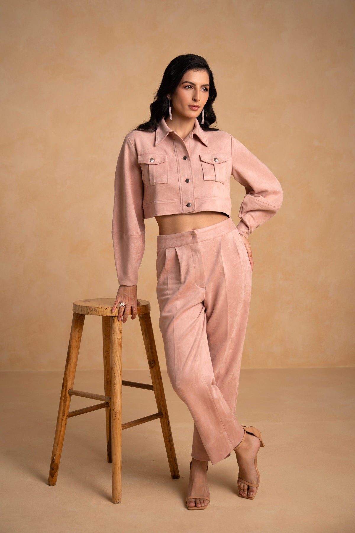 A sleek blend of structure and softness, this blush suede co-ord set captures the essence of modern femininity. The cropped jacket features front flap pockets and sharp tailoring that flatters the form, while the high-waisted trousers add balance with clean lines and a straight silhouette.