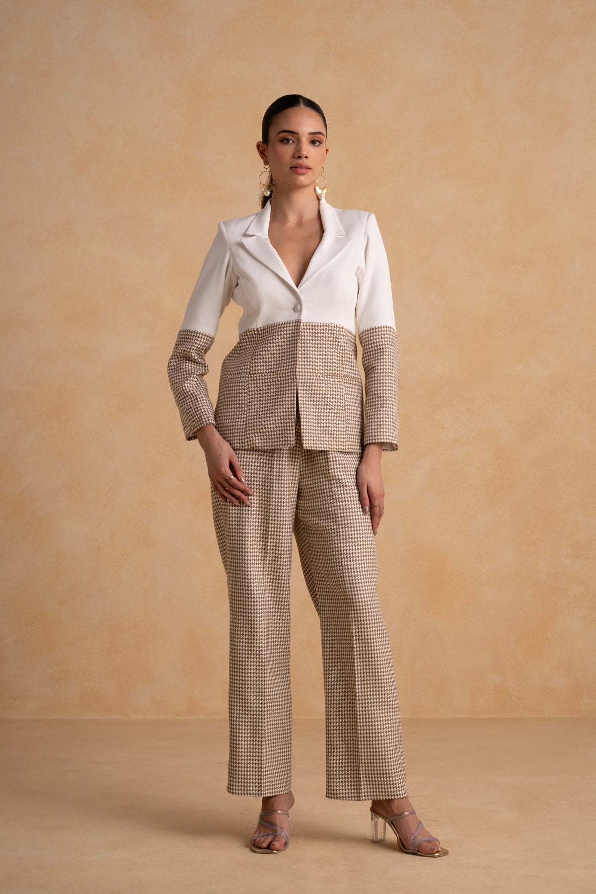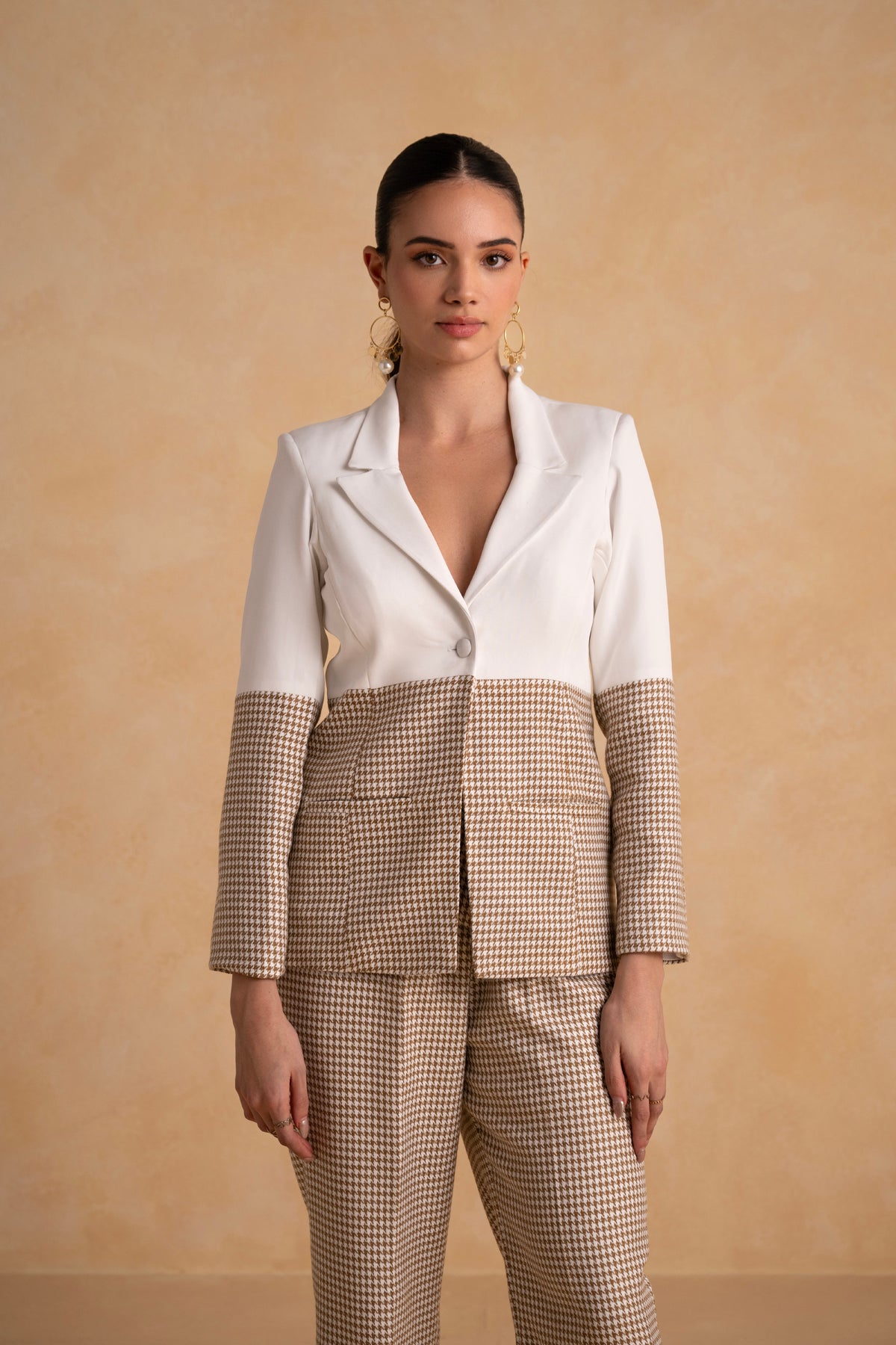 Smart, structured, and timeless — this houndstooth blazer set redefines modern elegance with a classic twist. The jacket features a sharp collar, tailored fit, and a clean single-button closure that flatters the silhouette.
